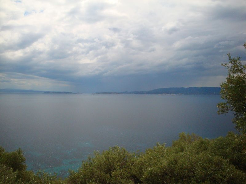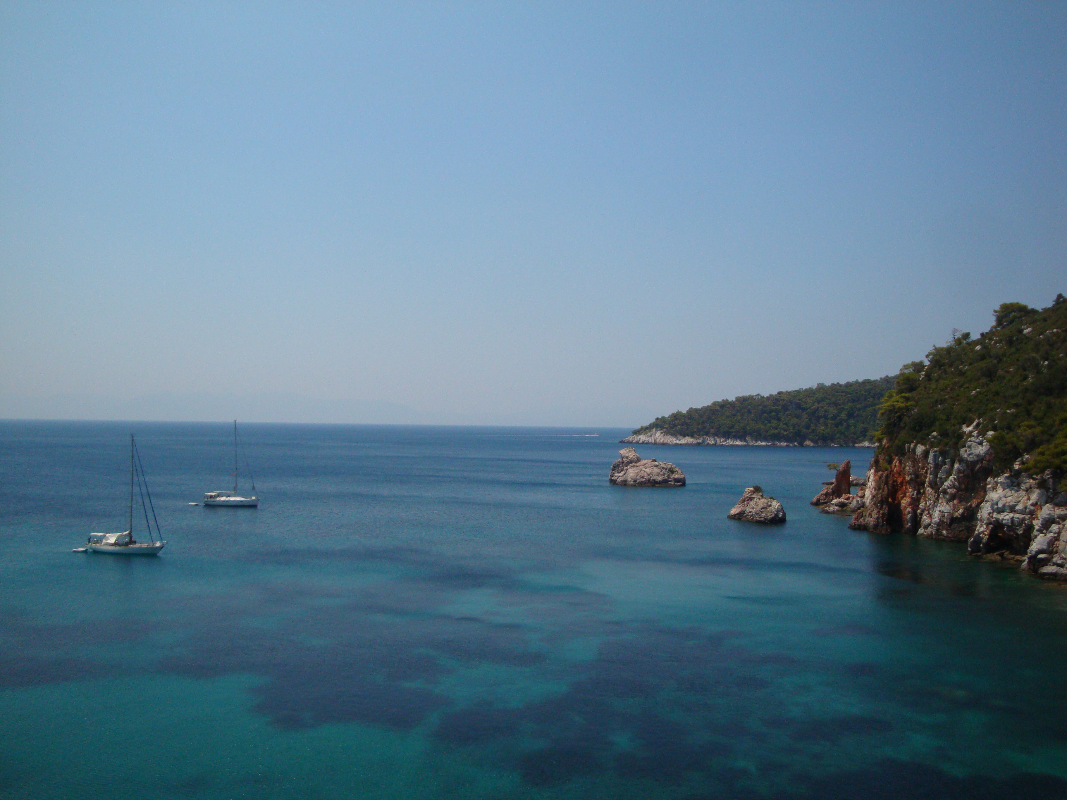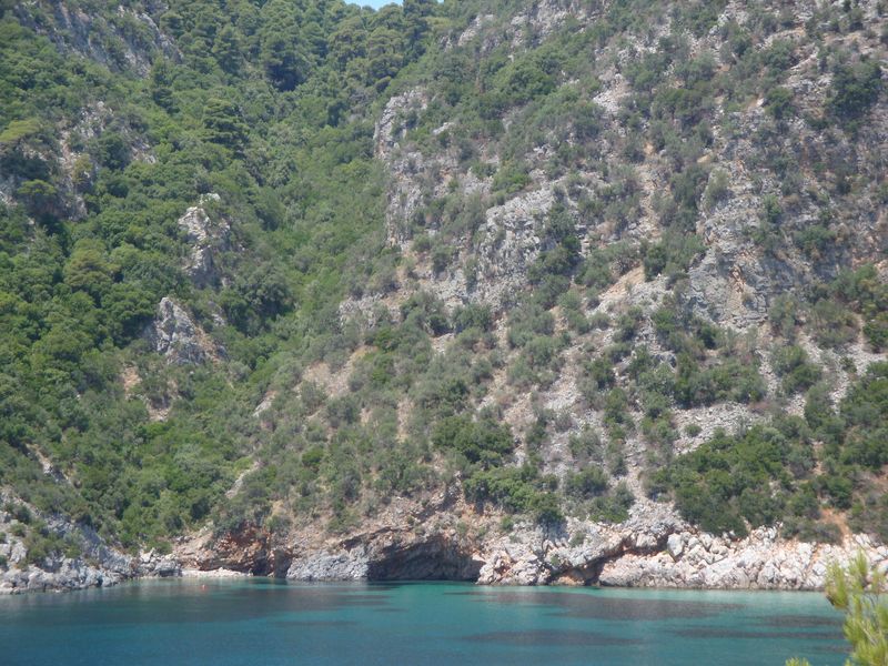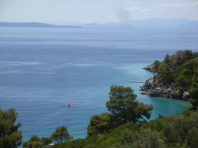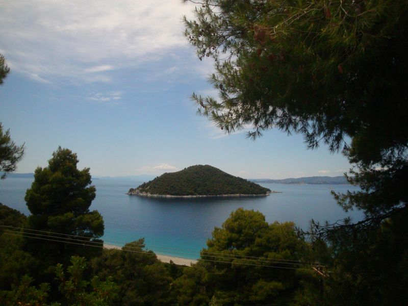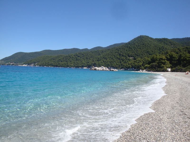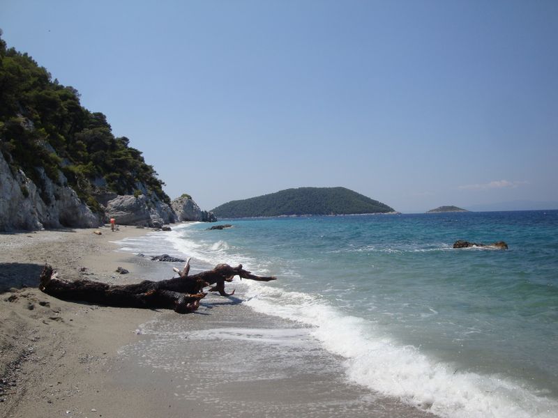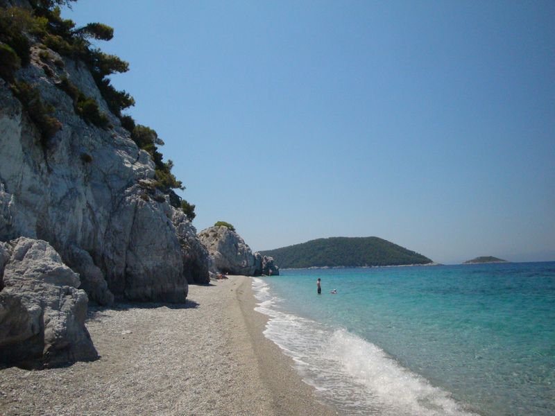 Запомнилась церковь из фильма «Мамма Миа», конечно, мы посетили ее... Там рядом есть красивый пустынный пляж и церковь Агиа Панагия (Αγία Παναγία) чуть выше по дороге. Запомнился пляж Стафилос (Στάφυλος), особенно самая правая бухта, которую я переплыла несколько раз и долго лежала в пещерке на спине, слушая тихое журчание воды.