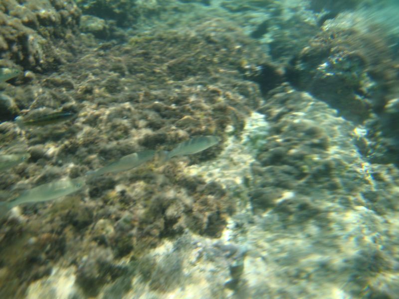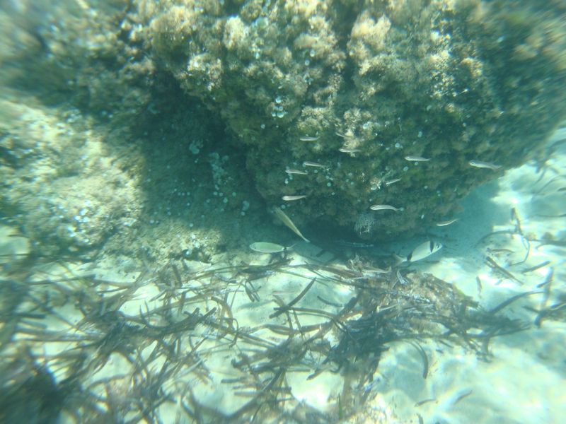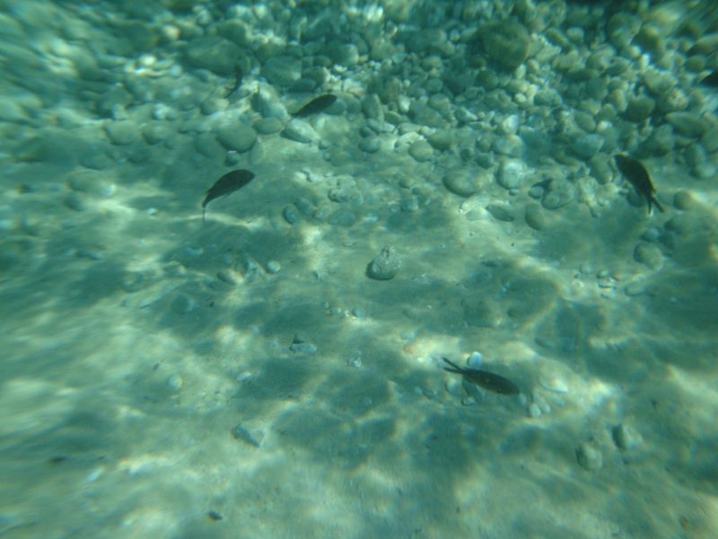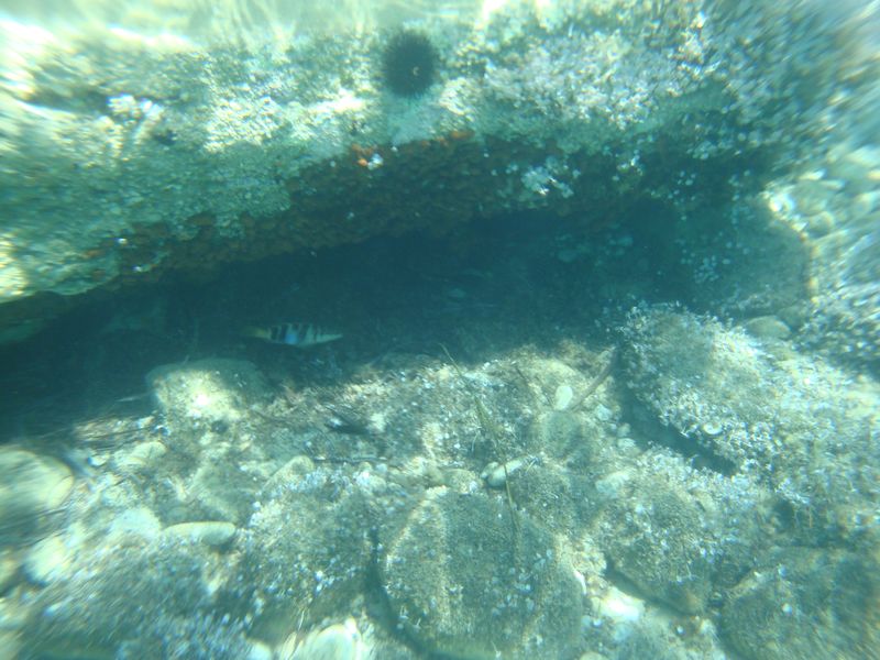 Слева от нашего пляжа Панормос (Πάνορμος) мы нашли под водой остатки ранних портовых сооружений, а, может быть, и древнего города, который когда-то был здесь. Справа от пляжа были уютные бухточки, куда с удовольствием забирались парочки, любящие купаться и загорать нагишом, а на плоских камнях с невозмутимым видом сидели и грелись греческие ящерки. Раз или два мы видели подозрительную темную спину с плавником в море, которая поначалу вызвала много вопросов – как оказалось, сюда приплывают дельфины… А мы-то думали! ;)