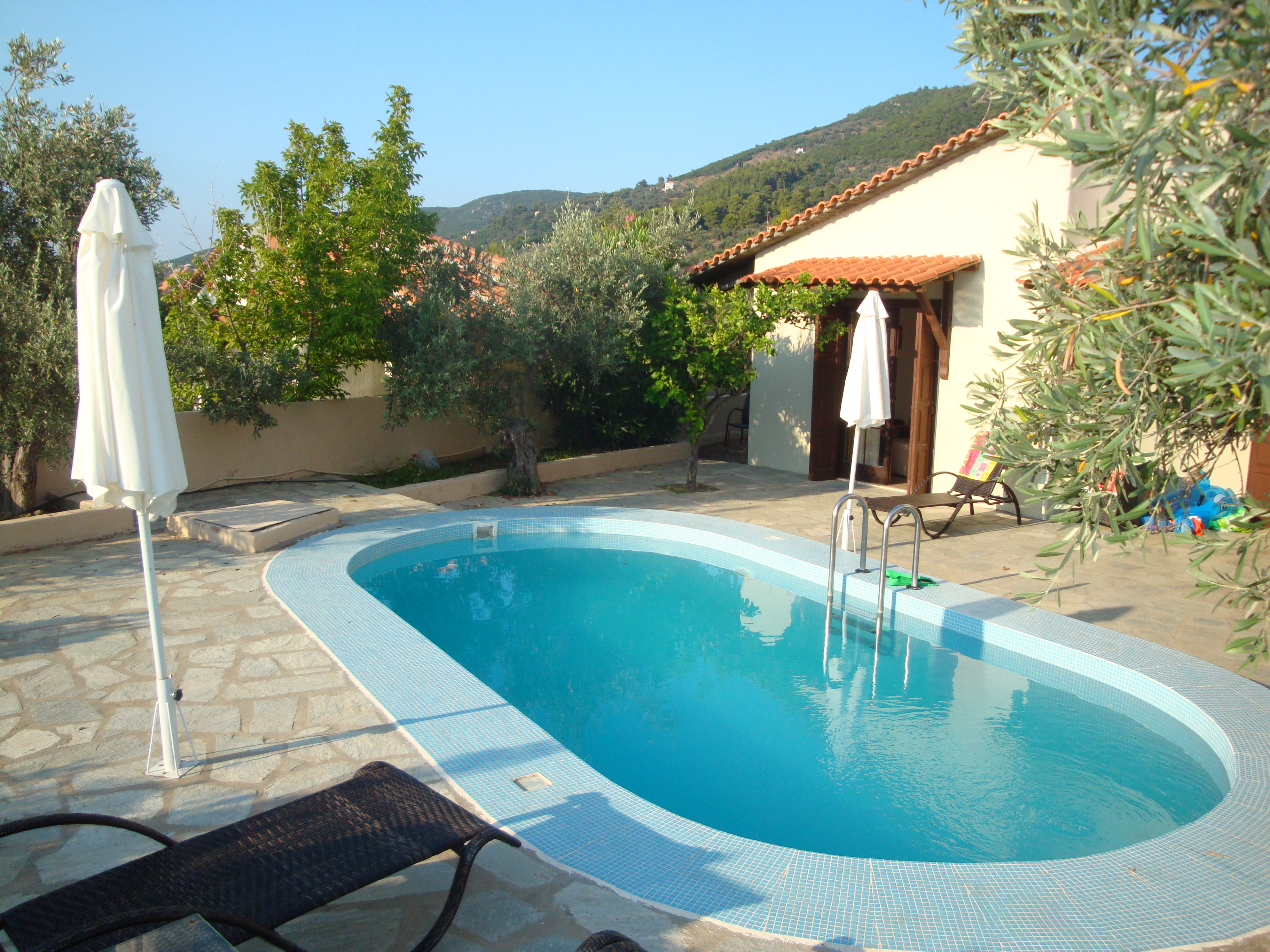 В конце отдыха мы переехали на несколько дней в бунгало с личным бассейном. Сидишь себе на веранде вечером у бассейна, попивая греческое вино под оливковыми деревьями, и любуешься звездным небом над ночным городом – изумило то, что обычный строительный магазин на холме светится почти как Парфенон! Никакой экономии, сказали бы строгие немцы, зато какая красота, подумали мы!:)